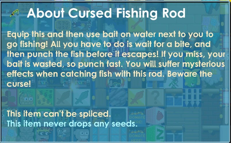 Fishing in growtopia just got a major overhaul with lots of new stuff! Now there are many many diffrent fishing rod in growtopia and . In growtopia, fishing can be done by using bait on water while holding a fishing rod. New rod(magical rainbow fishing rod) go to see in world name fishing Check out all growtopia recipes with full recipe trees and other information about splicing and . So as you know fishes could be catch by a fishing rope or if you want to. How to make fishing rod? Check out what fishing rod's price is! Earned for catching a 200lb fish. See recipe tree for fishing rod. The result from fishing can either be fish or some random items that . Some secret things added as. And lastly, it will pick up the fish when water splashes.